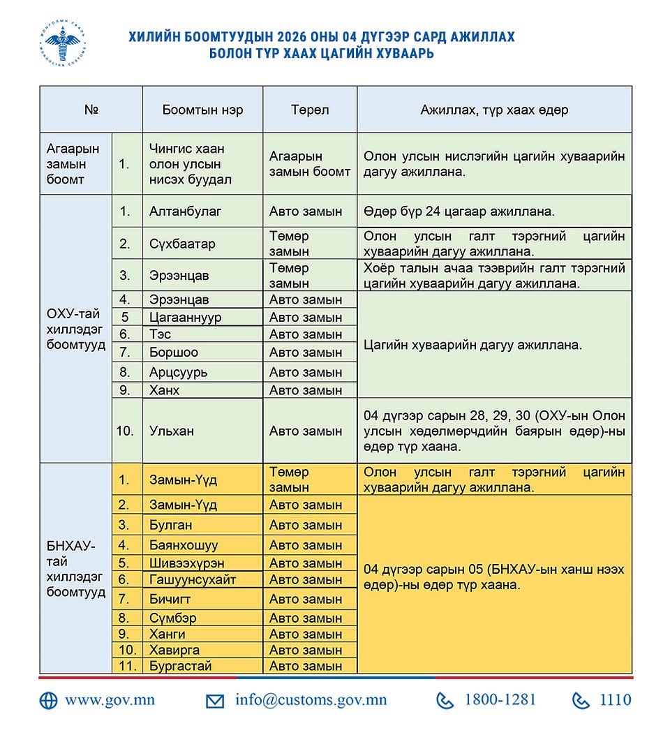 Хилийн боомтуудын дөрөвдүгээр сард ажиллах хуваарь